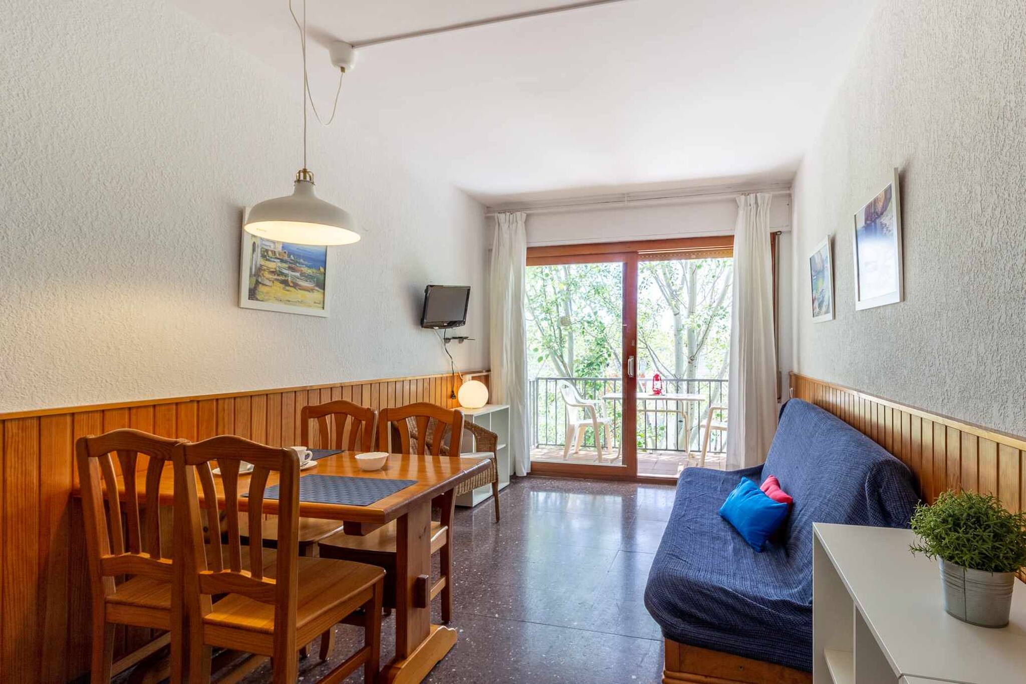 Menjador: sala d'estar amb 1 sofà llit individual, TV, taula de menjador amb cadires de fusta.