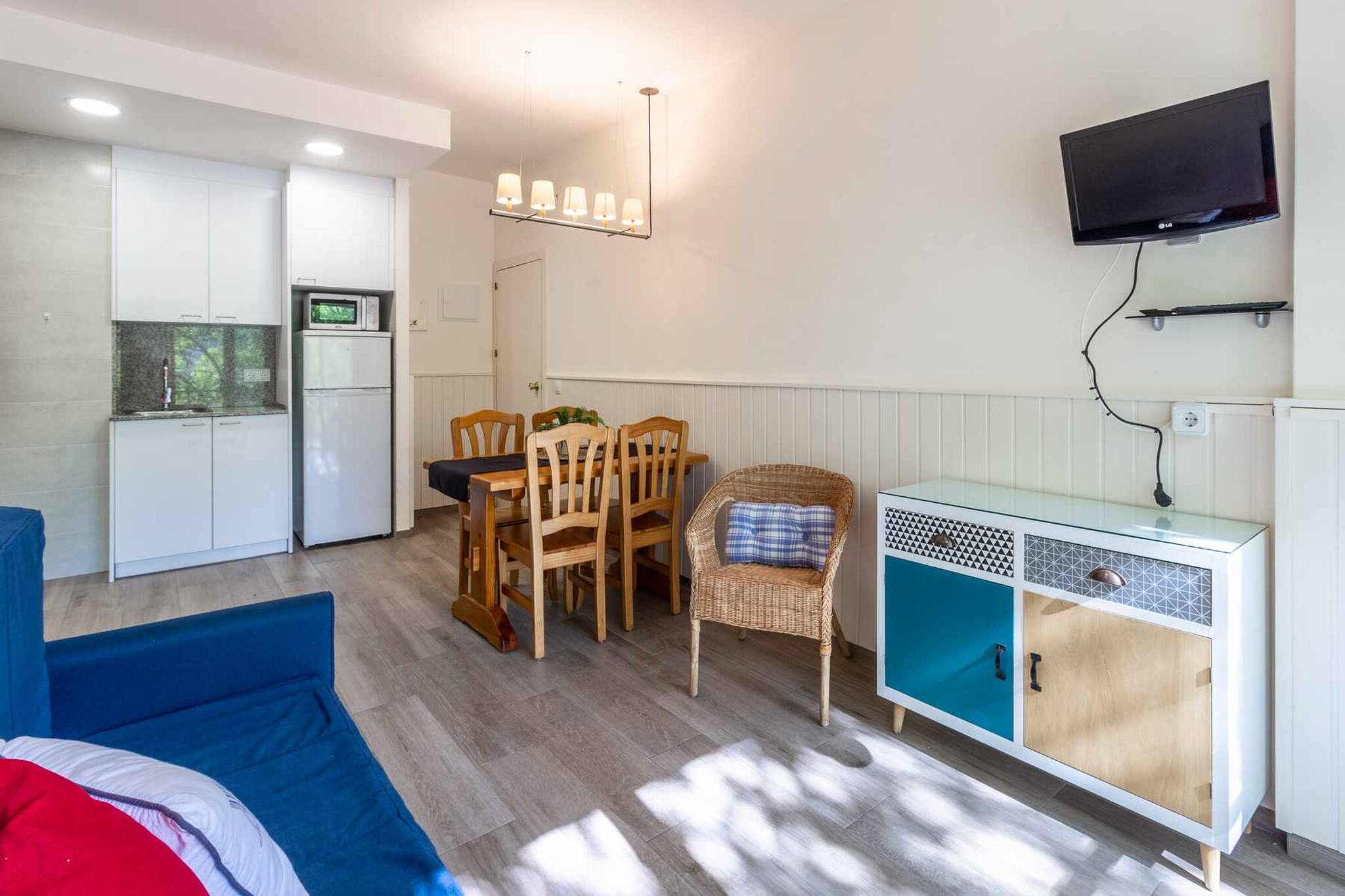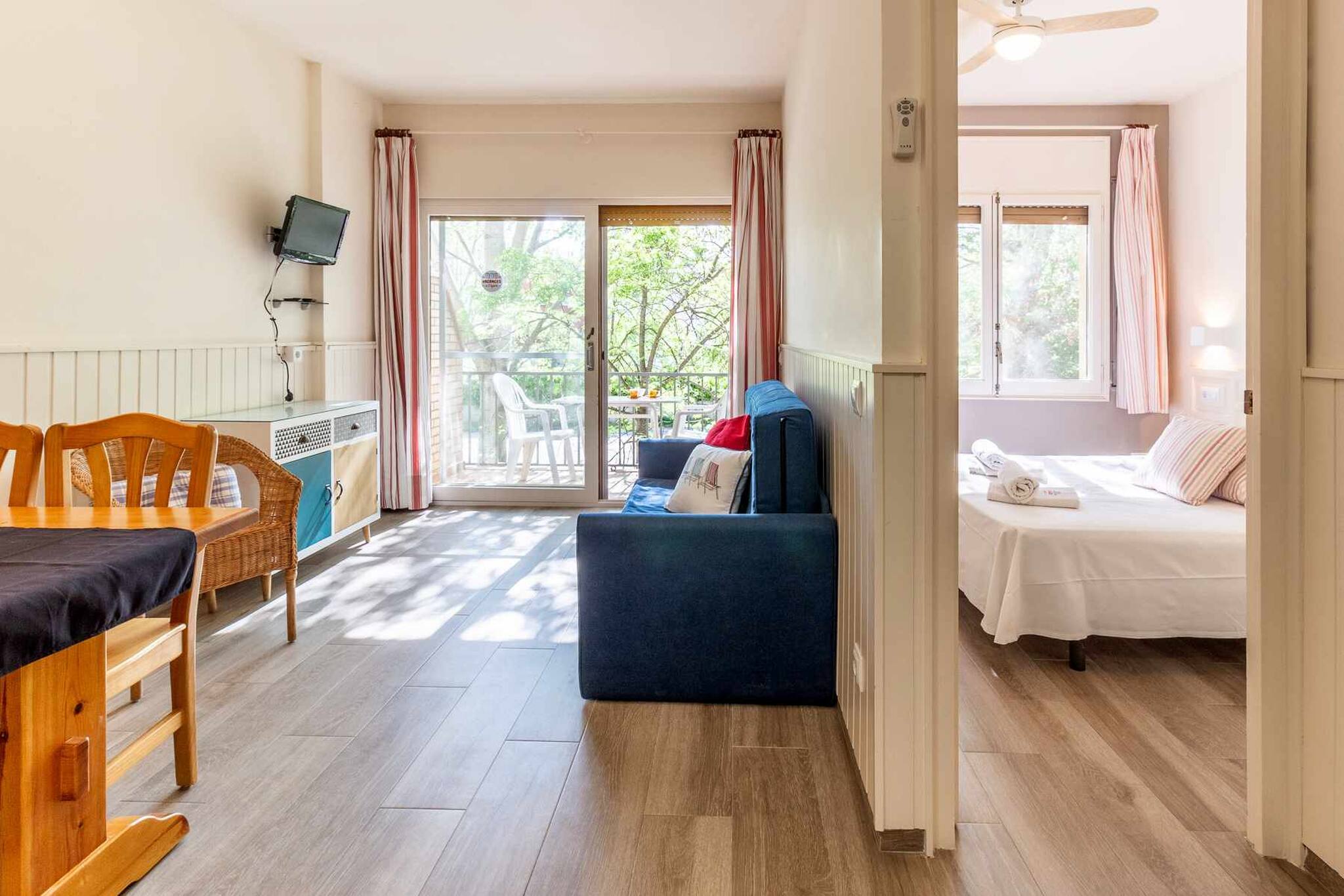 Disposa d'una habitació amb llit de matrimoni amb armaris encastats. Bany complet amb plat de dutxa. Cuina petita però ben equipada al costat del menjador, i sala d'estar-menjador amb un sofà llit individual, taula i cadires de fusta i sortida a la petita terrassa amb mobiliari d'exterior.