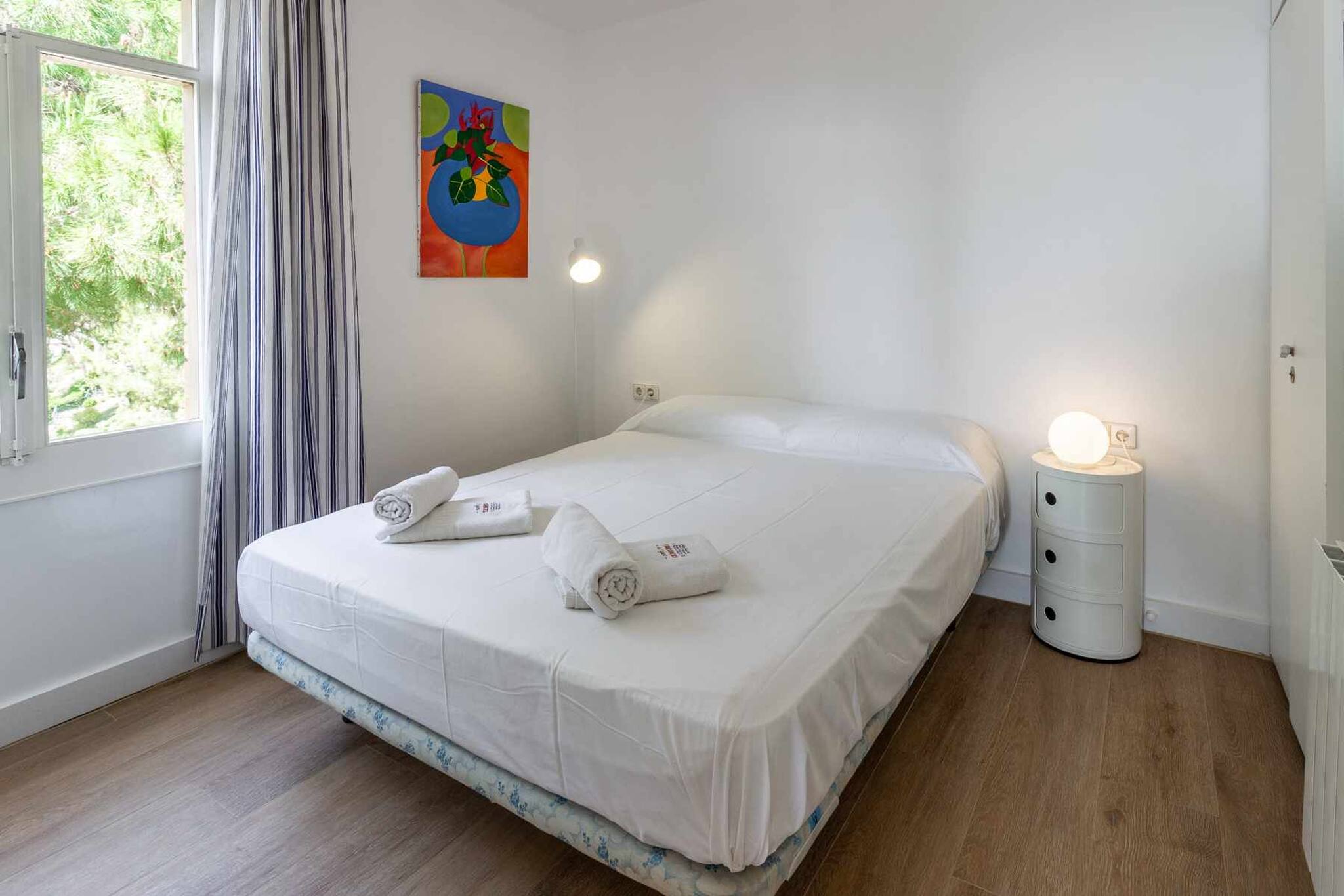Habitacions: una habitació amb llit doble de matrimoni, una habitació amb dos llits individuals. Tauletes, armari, calaixeres, llum de lectura i penjadors. Sofà llit al menjador. Roba de llit.
