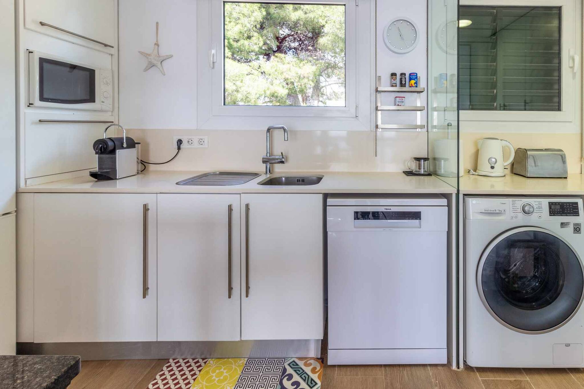 Cuina equipada amb nevera, congelador, microones, taulell de cuina, cafetera melita, bullidor d'aigua, torradora, vaixella.