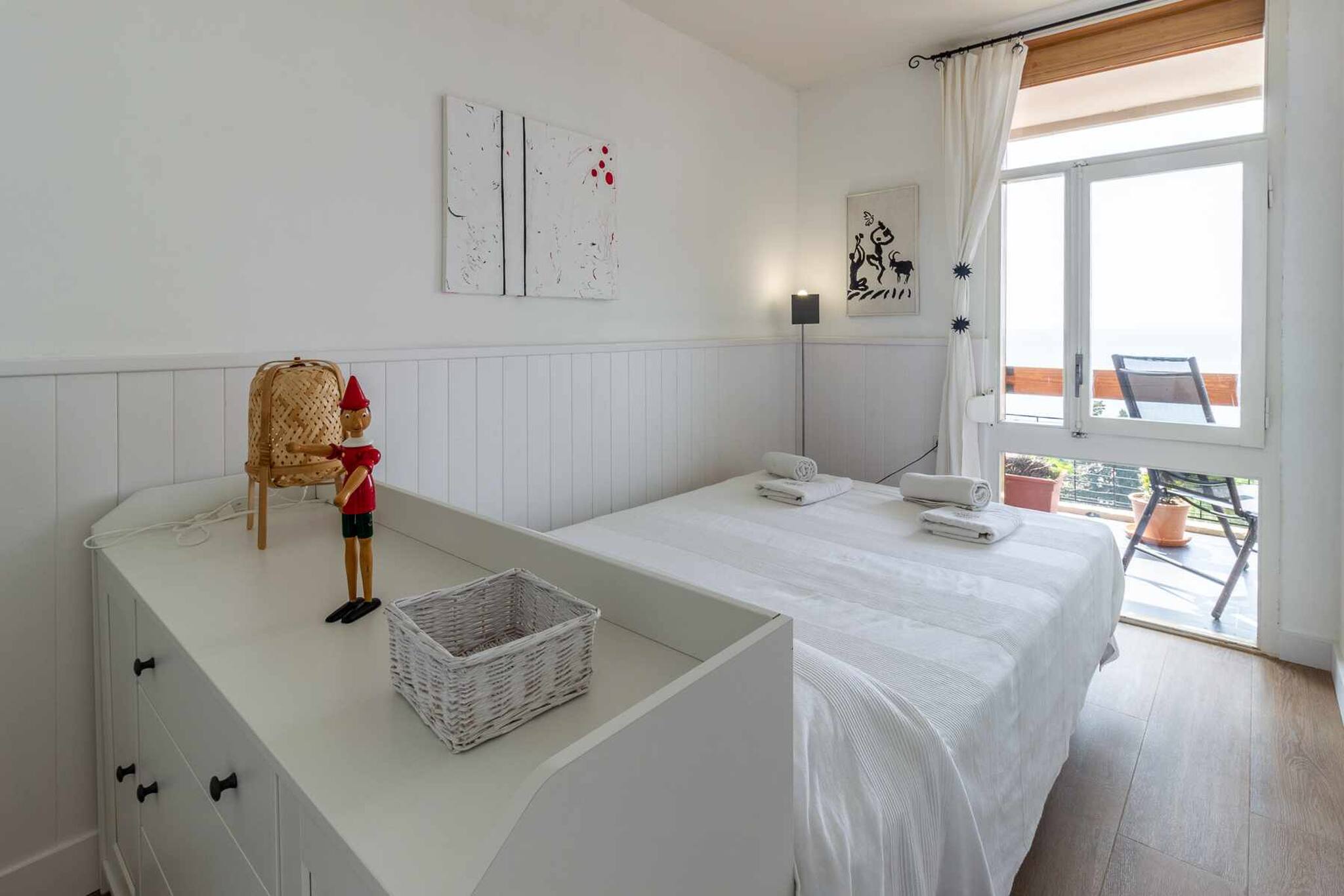 Habitacions: una habitació amb llit doble de matrimoni, una habitació amb dos llits individuals. Tauletes, armari, calaixeres, llum de lectura i penjadors. Sofà llit al menjador doble. Roba de llit.