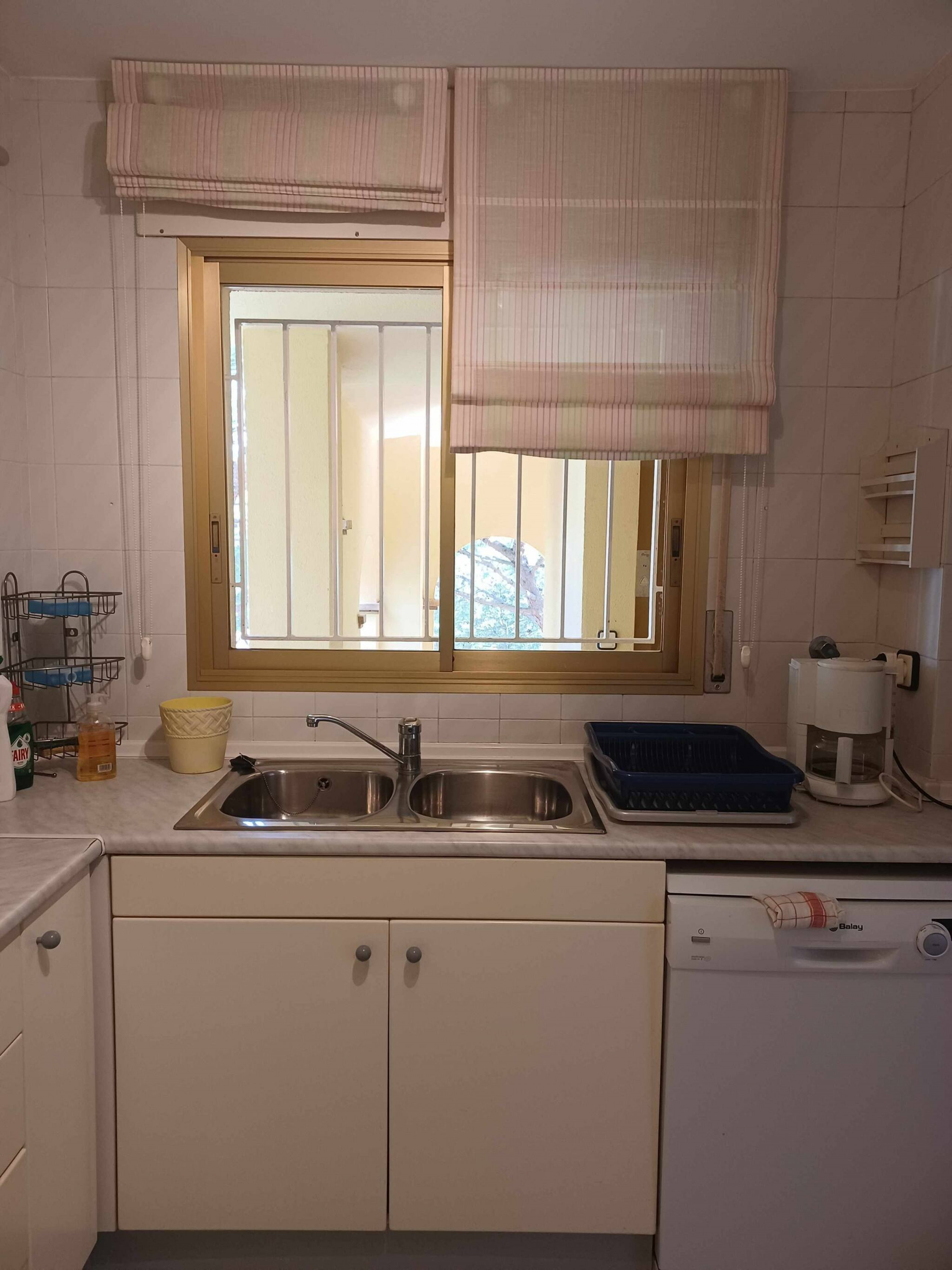 Cuina equipada amb nevera, congelador, microones, taulell de cuina, cafetera melita, bullidor d'aigua, torradora, vaixella.
