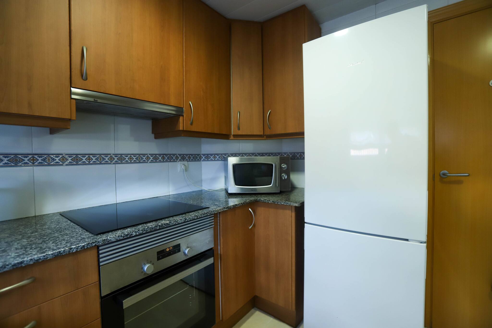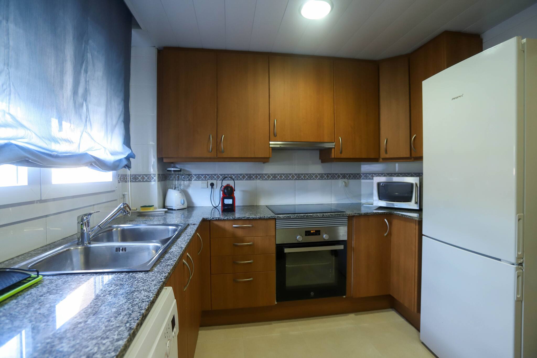 Cuina americana equipada amb nevera/congelador, microones, cafetera Melitta, forn, torradora, vaixella.
